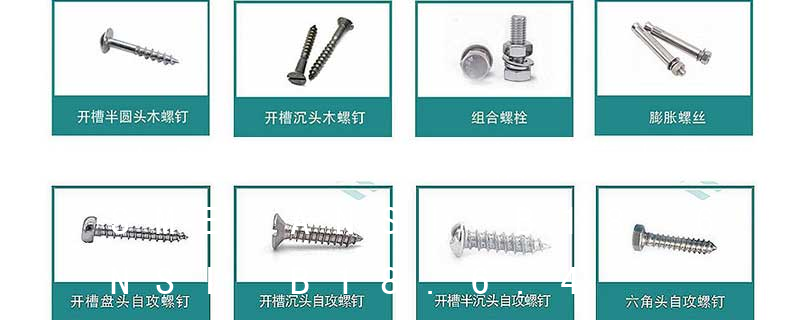 1.機螺釘 2.自攻螺釘 3.鉆尾螺釘 4.墻板釘 5.纖維板釘 6.木螺釘7.六角木螺釘 8.不脫出螺釘 9.組合螺釘 10.微型螺釘 11.家具螺釘 12.電子螺釘 13.鏈帶螺釘頭型 :1.六角頭(hexagon head)2.六角頭法蘭面(hexagon head with flange)3.方頭(square head)4.T形頭T head (hammer head5.